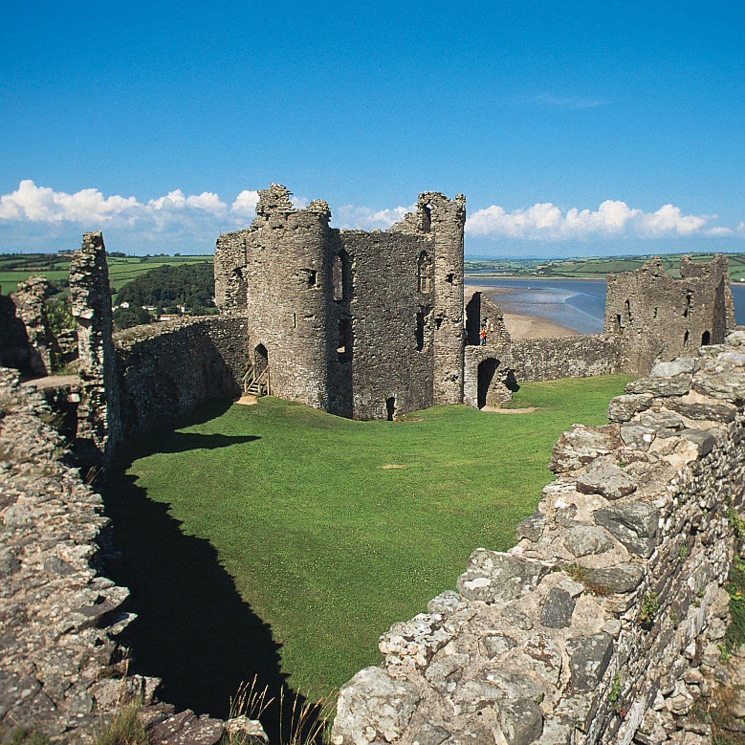 A little further afield, in the county of Carmarthenshire, there are more spectacular Welsh Castles to visit. The most well known of these is probably Kidwelly Castle. It began as a wooden ringwork castle in the early 12th century, protected only by an earthen bank and ditch. Not surprisingly it was constantly under attack. In the 1280s a stone ‘castle within a castle’ was built, and this still stands today. A gatehouse was later added, making Kidwelly a match for any castle in Wales. To attack the castle you would have to conquer the gatehouse with its drawbridge and portcullis, whilst being attacked by arrows and rocks. If you breached these outer defences, you would then face the four inner towers! Even the forces of Owain Glyndwr couldn’t break through such defences! Kidwelly Castle has appeared on screen in the film ‘Monty Python and the Holy Grail’. Regular events such as Birds of Prey Displays, Plays, Concerts and Exhibitions take place at Kidwelly.