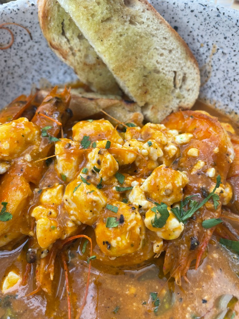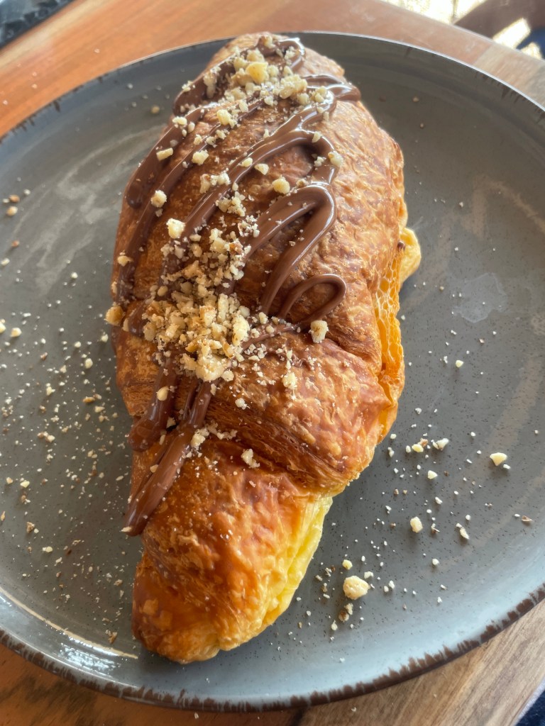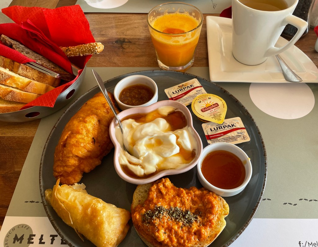 Breakfast tends to be of a continental style in Greece. Breads, cheese, ham, pastries, yoghurt and fruit. We had breakfast at our hotel most mornings but we did venture to Meltemi Brunch Cafe in the New Port a couple of times. Highly recommended for giant croissants! It was here I sampled a traditional Greek Breakfast of scrambled eggs with tomatoes, olive bread, local cheese pie, bread and homemade preserves, yoghurt and local honey, fresh orange juice and Greek Mountain Tea.