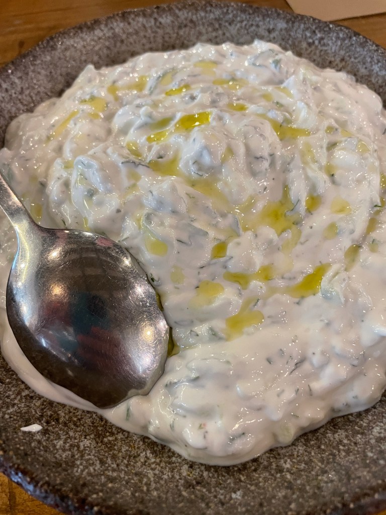 Greek tavernas usually offer a wide range of hot and cold appetizers and meze. I can never resist a Greek Salad with Feta or a creamy Tzatziki.
