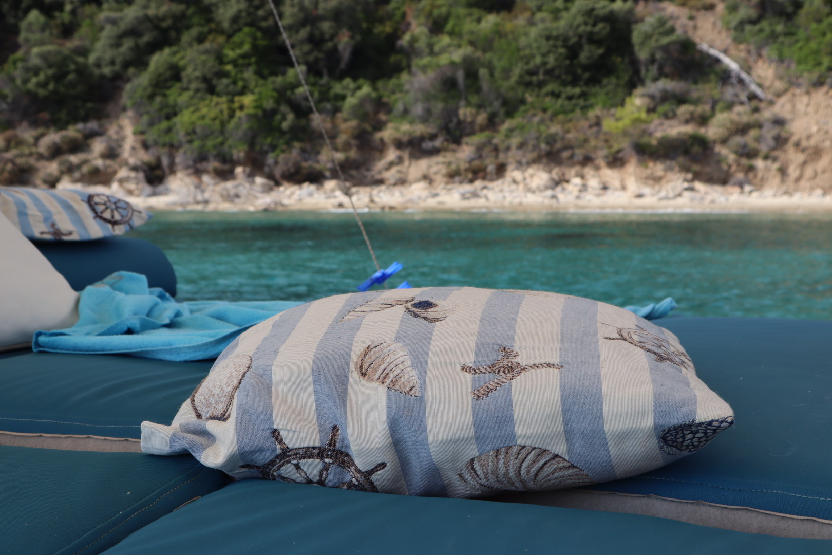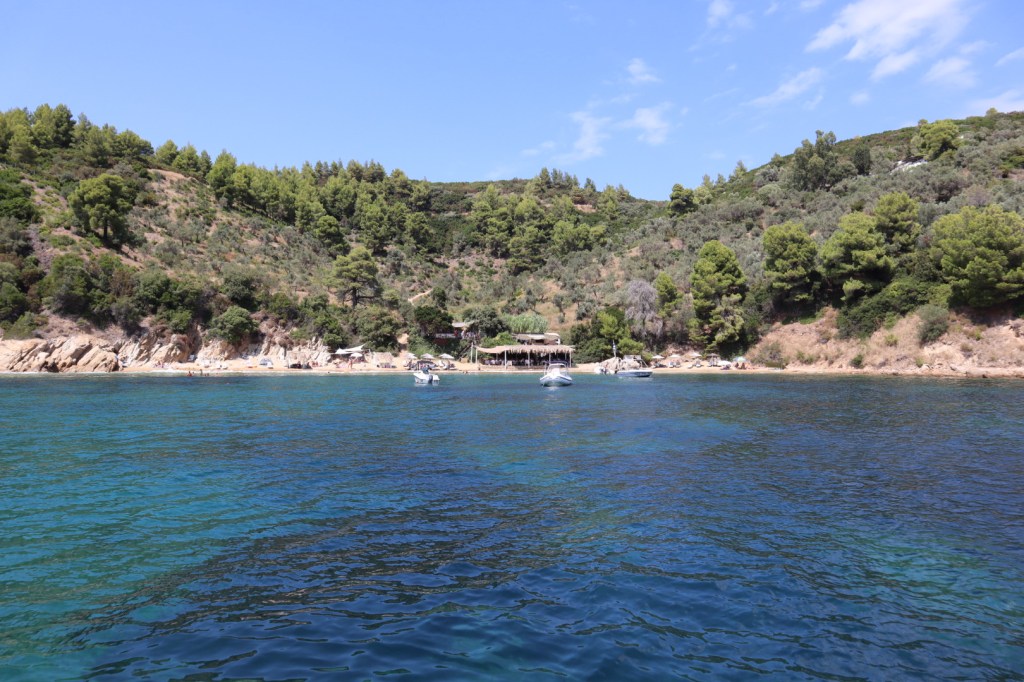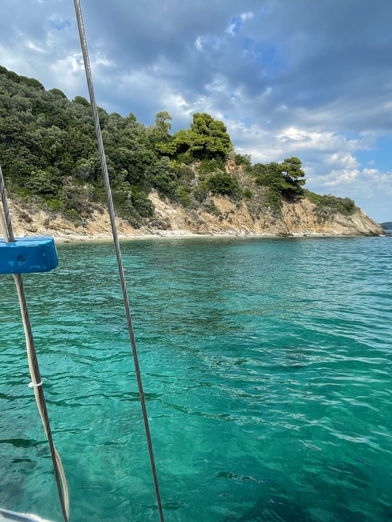 We chose the afternoon cruise, departing the New Port of Skiathos at 14:00 (returning at 21:30). The daily schedule is determined by the Captain, depending on the weather. The day we travelled it was windy so rather than sail to the northern, exposed beaches of Skiathos, we cruised along the southern coast of the island, taking in the views of the glorious, golden, sandy beaches. The beauty of sailing with a small boat is that you get to visit secluded beauty spots, away from the mass tourism of the large tour boats. You really feel like you’ve discovered paradise.