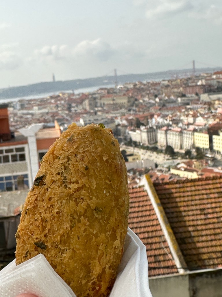 Our first stop was a point high above the city, with views of many of the landmarks of Lisbon including The 25 de Abril Bridge, The Sanctuary of Christ the King monument and Castelo de S. Jorge. Here we enjoyed Pastéis de Bacalhau (salt cod fritters), washed down with Ginja (sour cherry liqueur).